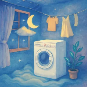 - 場所(部屋の中): 部屋は「心の内部」や「自分自身のプライベートな領域」を示します。部屋の中の洗濯機は、あなたの心や内面で何かを整理し、洗い流したい感情や思考があることを表しているかもしれません。